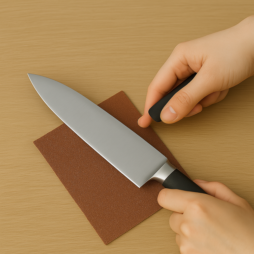한손은 목공용 사포 끝을 잡고, 다른 손은 주방칼을 잡아 사포 위에서 칼날을 살살 밀어주는 모습